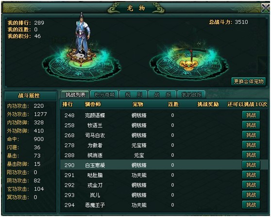 点击“斗兽场”进入界面,每天可挑战其他玩家10次,左下侧可以查看战斗属性,然后在挑战列表可以选择挑战对象