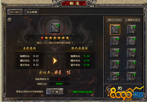 部位强化会提升属性,同时会消耗元宝以及相应的强化材料。