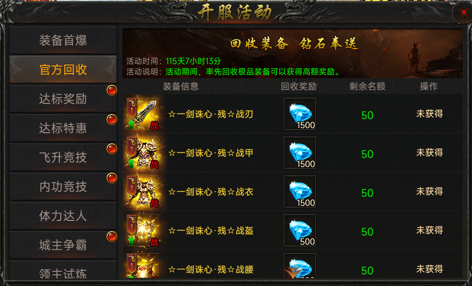 1、活动只统计玩家背包中的装备,当玩家背包中有可以回收的装备时,在活动界面中显示按钮“回收”,没有装备时界面中显示“未获得”;