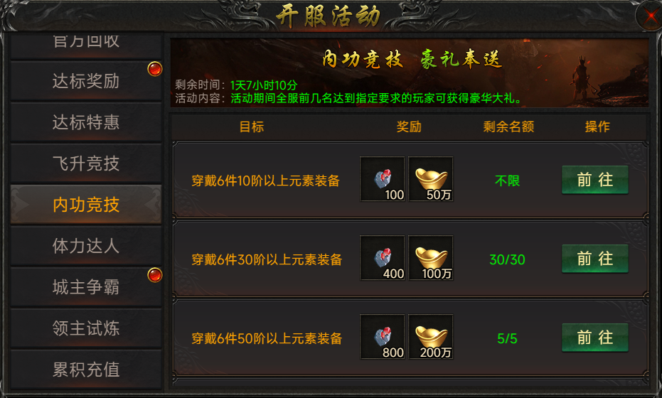 活动内容:活动期间全服前几名达到指定要求可获得豪华大礼