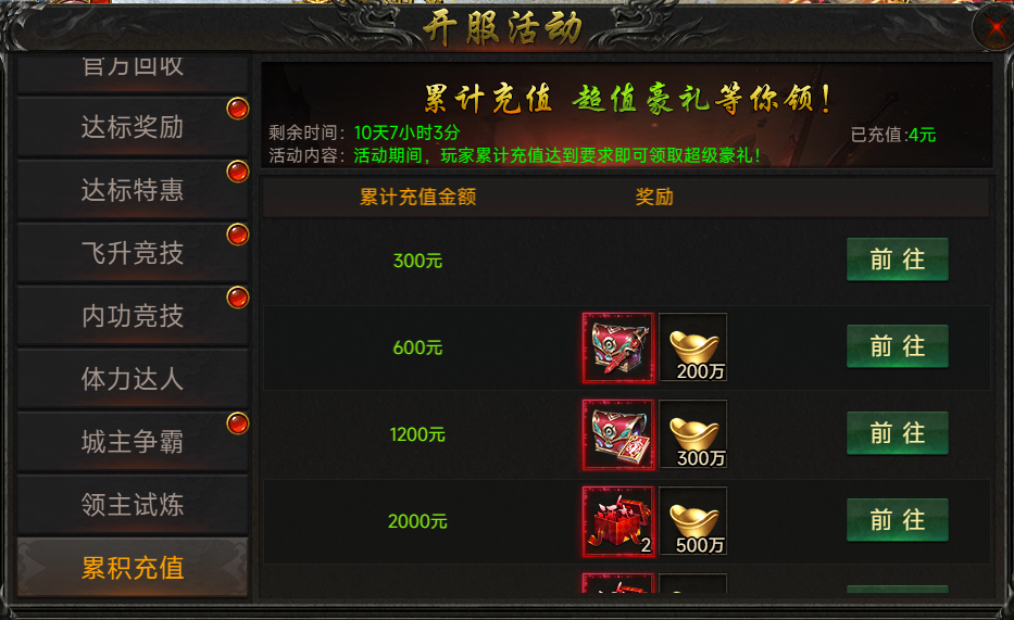 活动内容:活动期间,玩家累积充值达到要求即可领取超级豪礼!(界面领取)