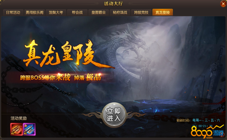 每周一、三、五、六日 21:00-21:30限时活动真龙皇陵开启,抢夺击杀BOSS,将获得稀有道具:传说图纸!可用来提升装备品质!