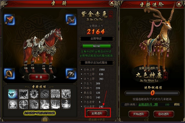 坐骑进阶有开始进阶和自动进阶两种方式,进阶需要消耗一定数量的坐骑进阶丹和铜钱,进阶成功后可以激活坐骑技能。