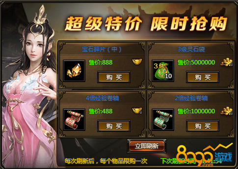 每日开启,玩家可在神秘商店中获得各种珍稀道具,甚至是绝无仅有的稀世奇珍。神秘商店每隔一段时间会刷新一次。刷新后会出现新的道具,每组道具仅能购买一次,直到下次刷新