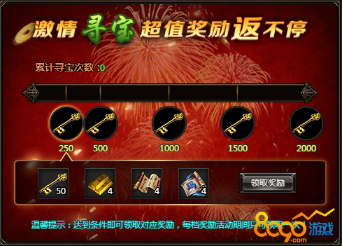 活动期间玩家累计寻宝次数满足条件,即可领取对应奖励