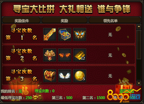 活动期间玩家累计寻宝次数满足排行条件即可参与排行,活动结束后,排行奖励通过邮件发送