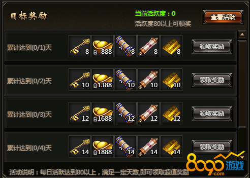 每周活动,每日活跃度达到80以上,满足一定天数,即可领取超值奖励。