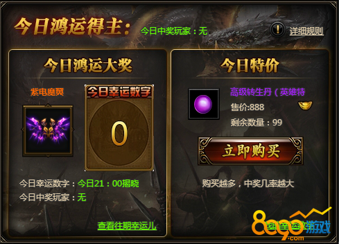 玩家购买1次特价道具可获得1个数字,每日21点抽取当天幸运数字,抽中的玩家可获得今日鸿运大奖。