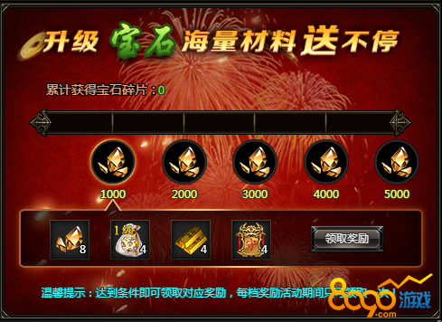 活动周四开启,持续一天,活动期间玩家累计获得宝石碎片满足条件即可领取
