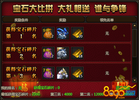 活动周四开启,持续一天,活动期间玩家累计获得宝石碎片满足条件即可参与宝石排行