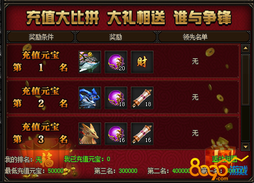 累充豪礼,活动期间内充值元宝达到条件可领取道具奖励