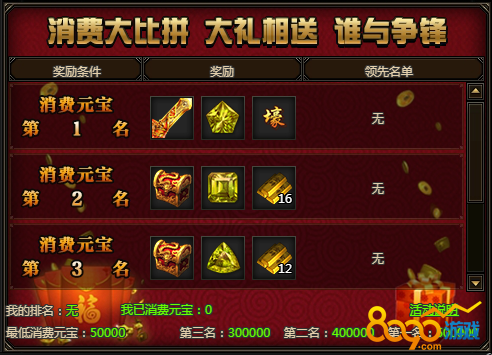 累计消费,活动期间玩家消费元宝达到条件即可领取道具奖励