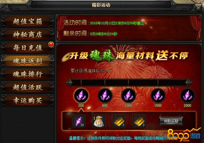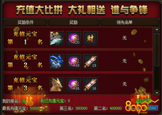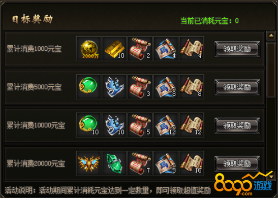 累充豪礼,活动期间内充值元宝达到条件可领取道具奖励