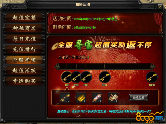 每周六开启,全服累计寻宝达到相应次数可获得相应奖励。
