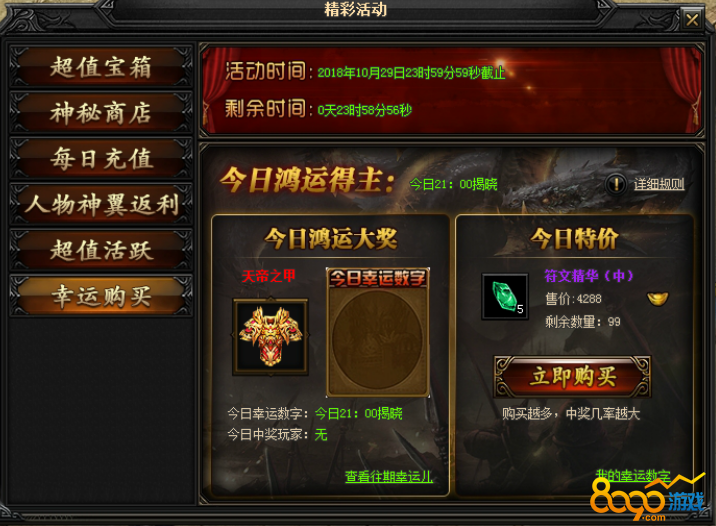 玩家购买1次特价道具可获得1个数字,每日21点抽取当天幸运数字,抽中的玩家可获得今日鸿运大奖。