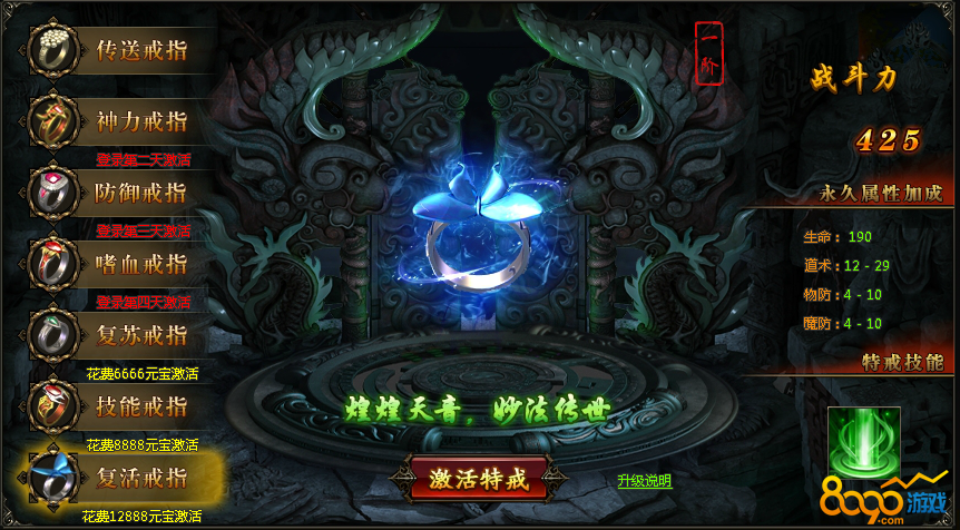 麻痹特戒/护身特戒/复活特戒,花费12888元宝激活。麻痹特戒攻击时有几率麻痹目标,护身特戒可以抵挡伤害,复活特戒可以抵挡致命伤害并回复一定的生命值。