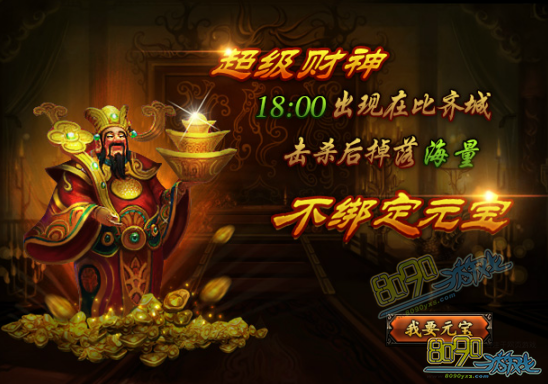 活动内容:每天18点会在比齐城出现财神BOSS,击杀会掉落非绑定元宝
