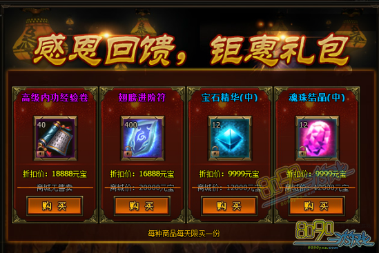 累充50000元宝:特戒礼盒*1,宝石精华(大)*1,魂珠结晶(大)*1,翅膀进阶符*218,坐骑进阶符*218