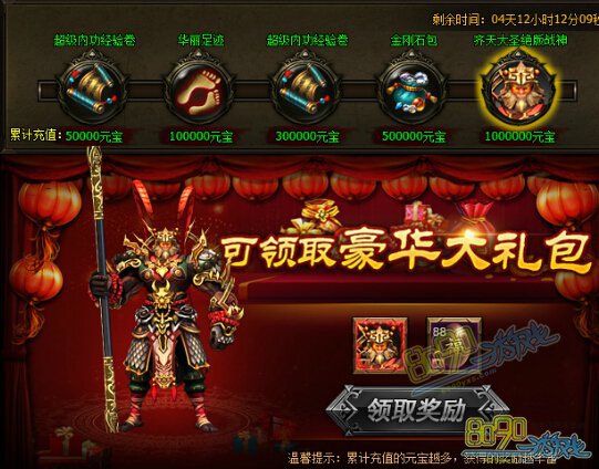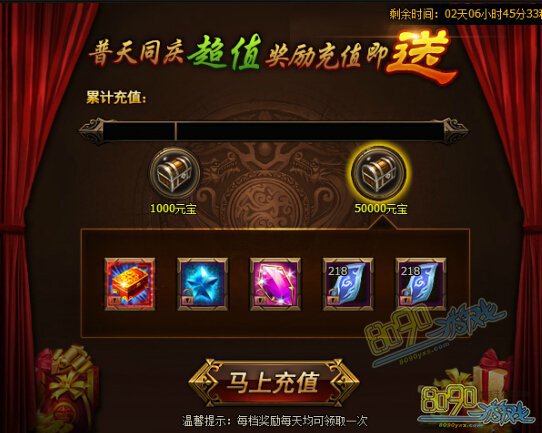 累充50000元宝:特戒礼盒*1,宝石精华(大)*1,魂珠结晶(大)*1,翅膀进阶符*218,坐骑进阶符*218