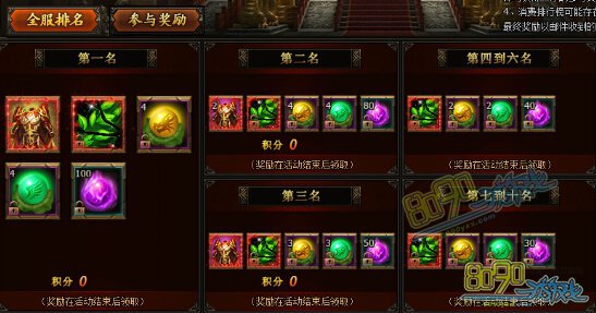 第1名:霸刺影神甲*1、青青子衿(3阶)*1、坐骑灵丹(永久)*4、翅膀灵丹(永久)*4、心法丹*100