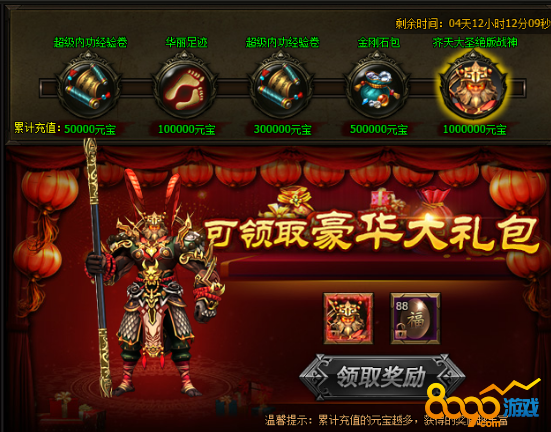 累计充值100W元宝:齐天大圣*1,福蛋(中)*88