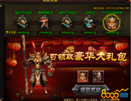 累充50000元宝:特戒礼盒*1,宝石精华(大)*1,魂珠结晶(大)*1,翅膀进阶符*218,坐骑进阶符*218