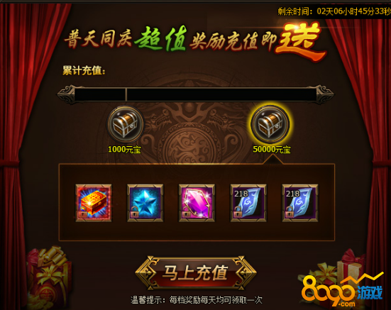 活动内容:活动期间内累计充值满一定的金额即可获得相应奖励