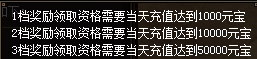 【活动内容】活动期间,玩家每天每充值1000元宝即可获得符文魔盒(1阶)和一百万绑金,不限数量,上不封顶,注:当天内领取完毕,隔天无效