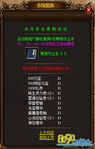 【活动内容】活动期间,每天10、14、18、20点会掉落大量寒假作业本,用5本寒假作业兑换可随机获得以下奖励中的一种,注:请在活动结束前兑换完寒假作业本,活动结束后无法兑换