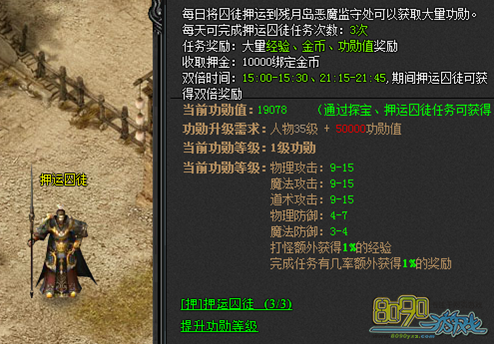 赤月传说土城npc处接受任务,将囚徒押韵到残月岛恶魔坚守处就可以获得大量经验、金币与功勋。需要各位玩家注意的是,15:00—15:30、21:15—21:45,这两个实践段内押韵囚徒是会获得双倍经验的,赶紧帮助npc将十恶不赦的囚徒押运到残月岛把。
