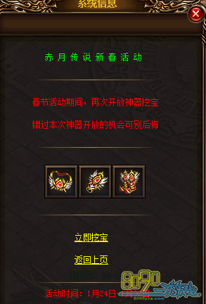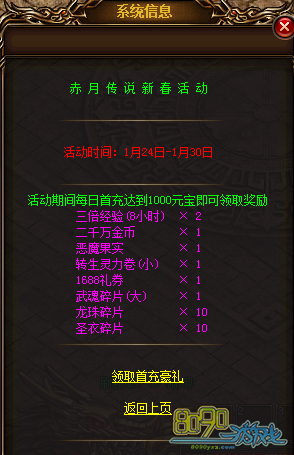 参与方式:玩家可打开右上角【节日活动】图标,或者在赤月皇城148,89【节日使者】处查看活动内容