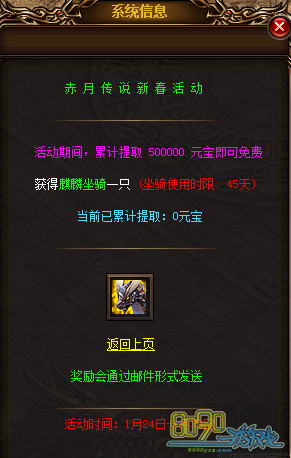【活动内容】活动期间,累计充值50w元宝可获得麒麟坐骑1只(只限1次)