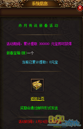 【活动内容】活动期间,每天累计充值30w元宝可活动1个新春宝箱