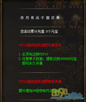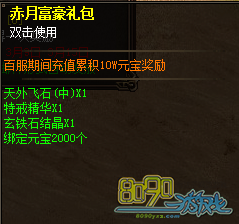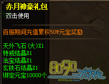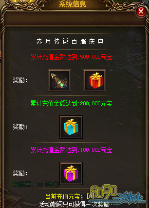 活动期间内,累计充值10w元宝可获得赤月富豪礼包