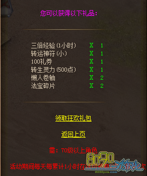 活动内容:活动期间内70级以上的角色每天每累计1小时在线可领一个狂欢礼包,每天最多6个