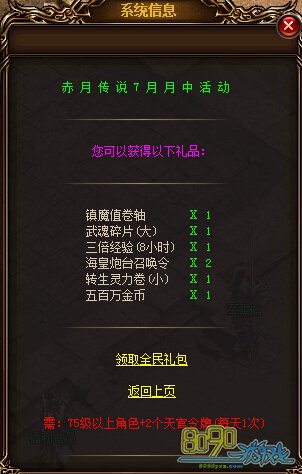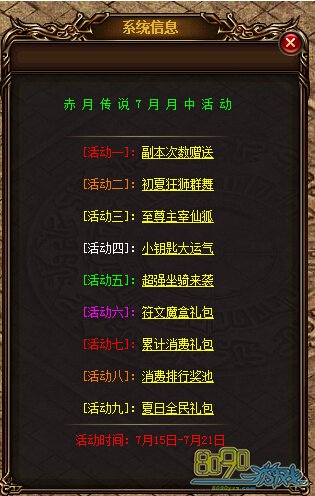 参与方式:玩家可打开右上角【节日狂欢】图标,或者在赤月皇城148,89【节日使者】处查看活动内容