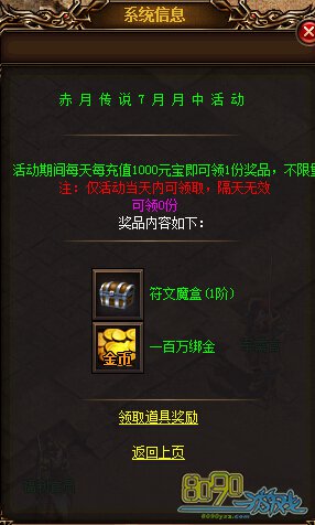 【活动内容】活动期间每天每充值1000元宝即可领1份奖品,不限量(注:仅活动当天领取,隔天无效)