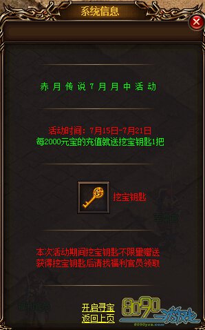 【活动内容】活动期间,每充值2000元宝就送挖宝钥匙1把(注:不限量,在福利官员处领取)