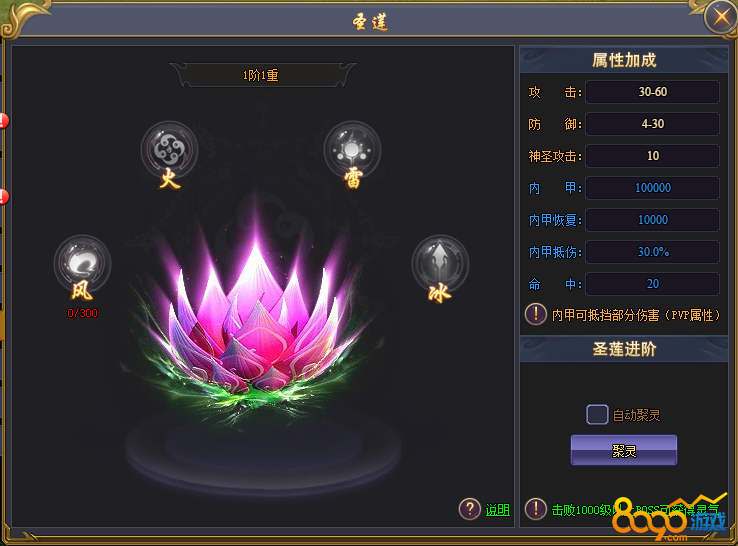 圣莲系统是通过击杀500级以上BOSS获得圣莲能量进行升级的系统,聚满能量球后可以进行聚灵,可获得大量人物属性
