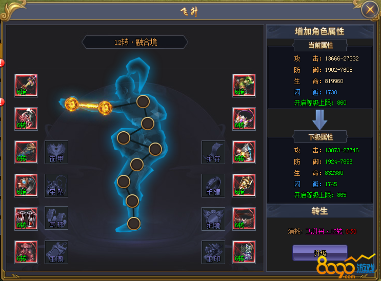 飞升共15级,飞升等级激活后初始为0级,通过使用飞升丹进行升级,飞升等级级增加大量人物属性