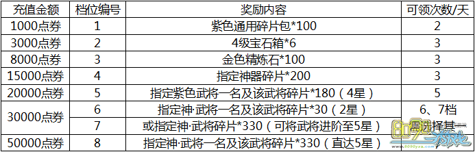 例:玩家当日充值8000点券,可选择领取8000档奖励一次,或选择1000档和3000档奖励各2次。
