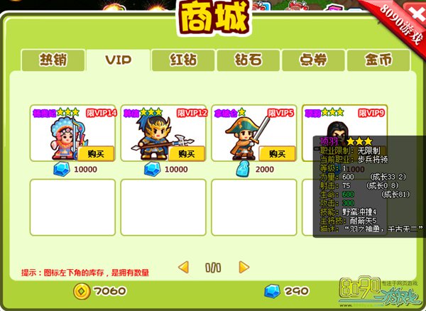 项羽的VIP等级要求是VIP9,当你符合以上要求后,可以进入到商城的VIP栏,直接花费1000钻石,就能长期获得项羽武将。大家获得相应的时候,他的进阶等级为3星,项羽的基础属性,从项羽的基础属性及其技能方面来观察的话,你可以考虑将项羽分配到骑兵里,这样能充分发挥出项羽的属性和技能效果,并能大大提升骑兵的战斗实力。大家拥有了项羽后,还有对其进行升级、进阶、佩戴装备等操作,项羽的实力才能得到进一步提升。
