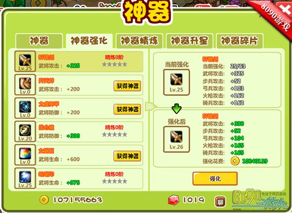 搜索"8090网页游戏"在8090村长征战团中不同的系统玩法,有不一样的强化功能。正如神器系统里大家也可以利用神器强化功能,来提升神器的属性。让你原本就很厉害的神器变得更加的强悍哦,那村长征战团神器怎么强化的呢?一起来看看吧。