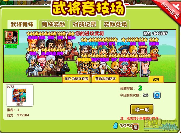 搜索"8090网页游戏"人往高处走,水往低处流,村长都要争上游!你想不想在8090村长征战团里出人头地呢?现在就有一个好地方让你快速成名哟!那就是武将竞技场了,这里不光要有实力还要有技术,那么就来看看吧!