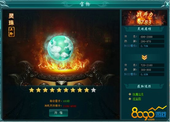 灵珠在160级开启。灵珠可消耗灵珠精华进行提升,每阶共十颗星,点亮十颗星后需使用宝物结晶进行突破进阶。灵珠精华可通过除魔任务和藏宝图挖宝等方式获得。提升灵珠等阶可为玩家提升BOSS增伤属性和战斗力。