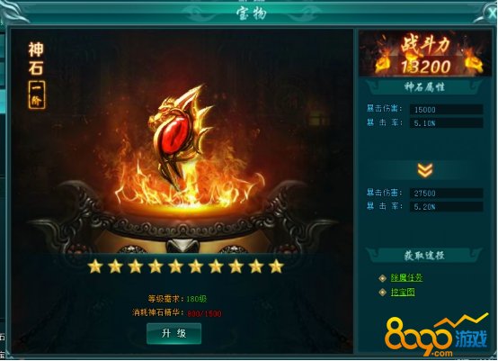 神石在180级开启。神石可消耗神石精华进行提升,每阶共十颗星,点亮十颗星后需使用宝物结晶进行突破进阶。神石精华可通过除魔任务和藏宝图挖宝等方式获得。提升神石等阶可为玩家提升大量暴击伤害属性和战斗力。