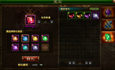 任意宝石,都能转化为同一级的其他宝石,最高只能转化8级宝石。宝石等级越高,所需的转化费用也越高。转化成功率为100%。