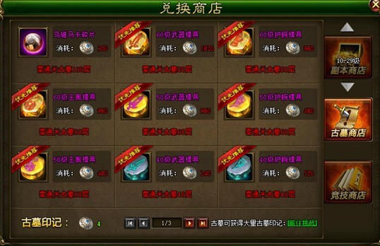 2.古墓商店主要出售人物右侧武器升级模具、秘籍以及战旗