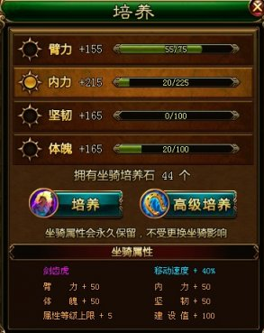 独步天下中,当玩家角色40级后就会开启坐骑另外一个功能,那就是坐骑培养功能。通过坐骑培养石增加坐骑对角色的加成属性,坐骑道具在活动和日常任务等都是可以获得的。