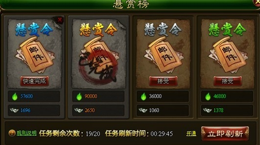 玩家可以在游戏中的悬赏大厅接到自己想要的任务,任务分为白绿蓝紫橙5种任务品质,品质越高收益越大。玩家每天有20次任务次数,每天00:00会重置任务次数,不过,玩家已经接受的悬赏任务可以遗留至第二天完成,并且不会消耗第二天的任务次数。